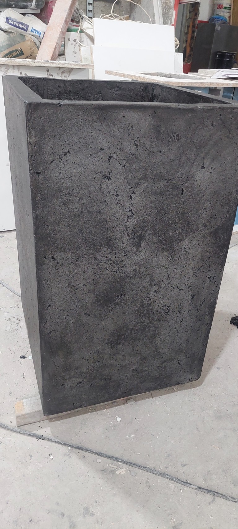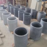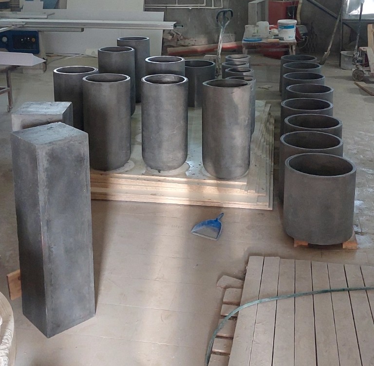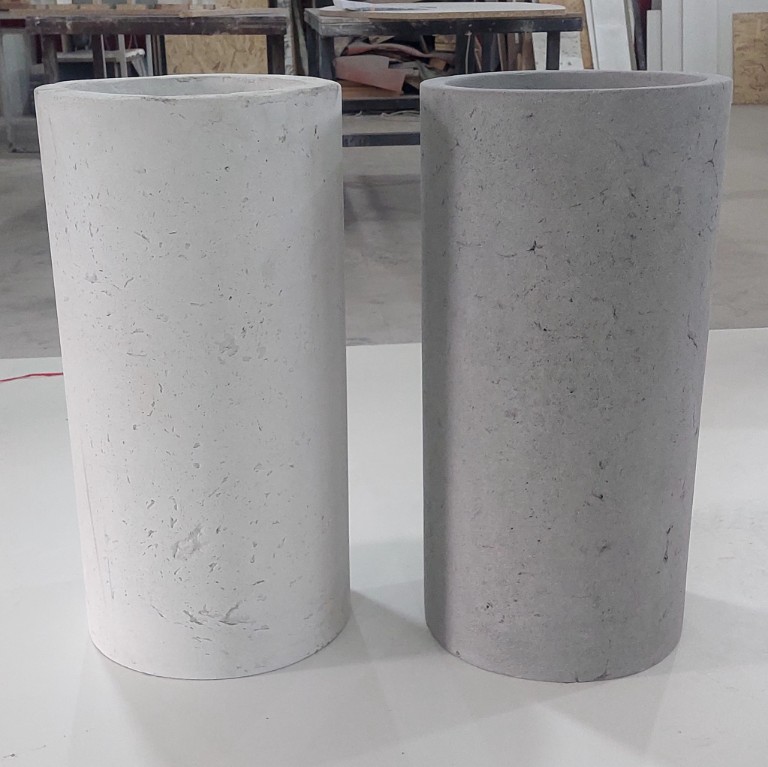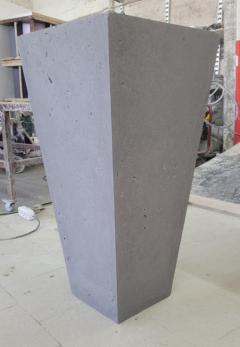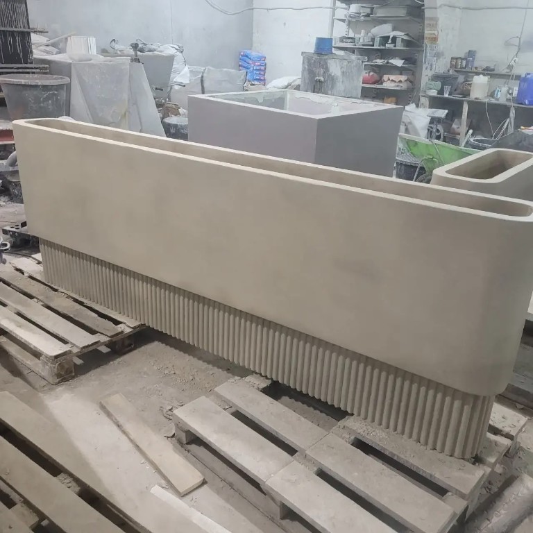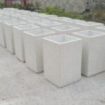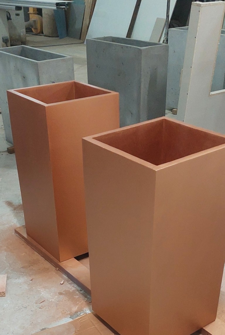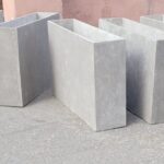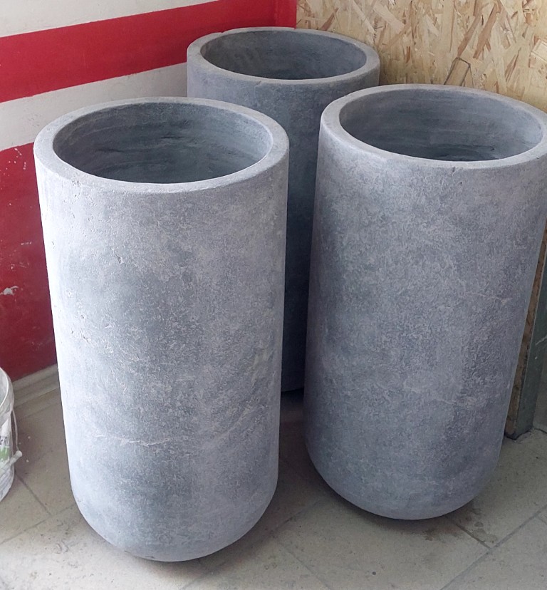 Применяем прочный армированный бетон. Он обладает повышенной морозостойкостью и низким водопоглощением. Бетонные кашпо тщательно шлифуются. Дополнительно обрабатываются гидрофобными пропитками. Это дает защиту от влаги, УФ, реагентов и истирания. Для уличных моделей проводим дополнительную герметизацию. Устанавливаем дренаж.